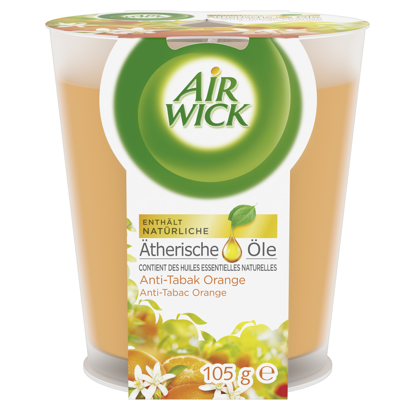 Air Wick Wohlfühl-Duftkerze Anti-Tabak Orange - Entdecken Sie den mediterranen Duft von saftigen Orangen und Zedernholz, effizient gegen Gerüche.